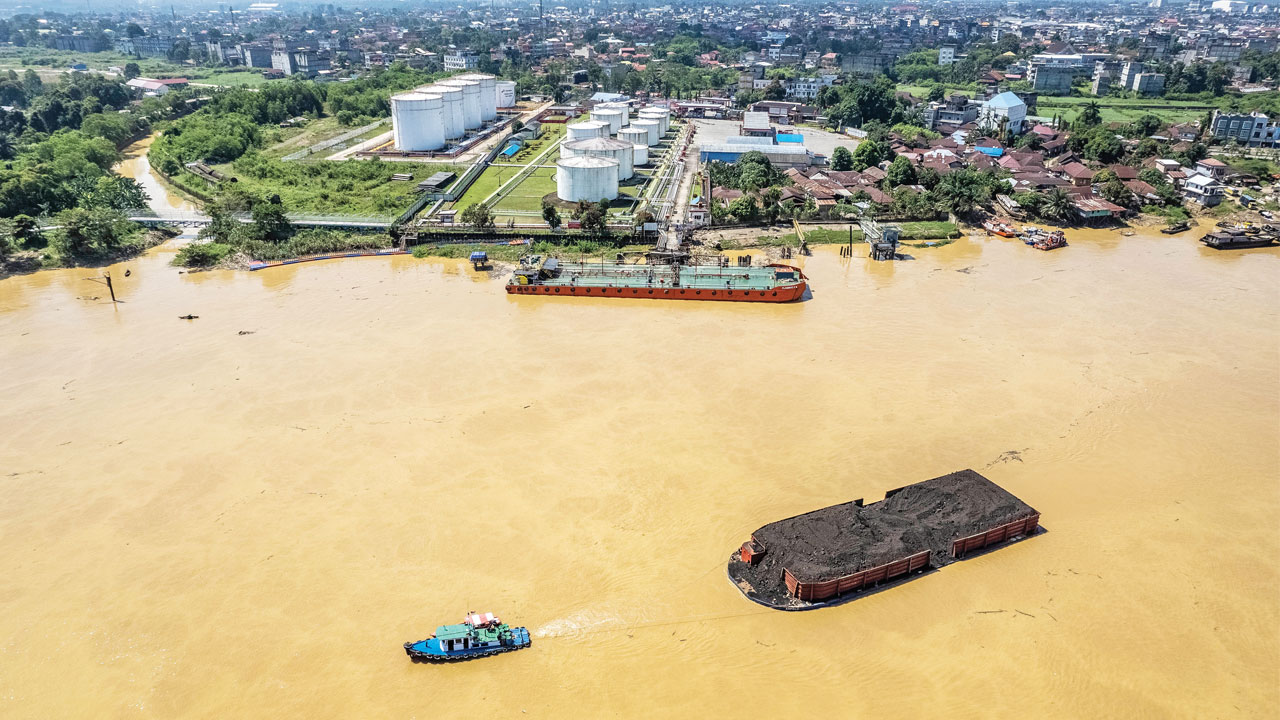 TARIF NAIK: Foto udara kapal tongkang bermuatan batu bara menyusuri Sungai Batanghari di Jambi, Kamis (10/4/2025). Menteri Energi dan Sumber Daya Mineral (ESDM) Bahlil Lahadalia menyampaikan tarif royalti minyak dan batu bara (minerba) mengalami kenaikan --