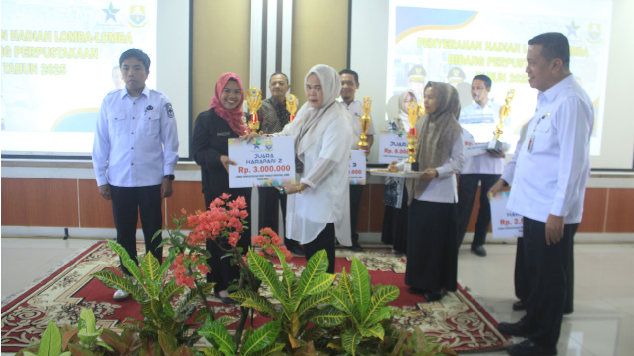 Kabid P3KM Desmayeny, S.E saat menyerahkan penghargaan kepada perpustakaan desa terbaik.--